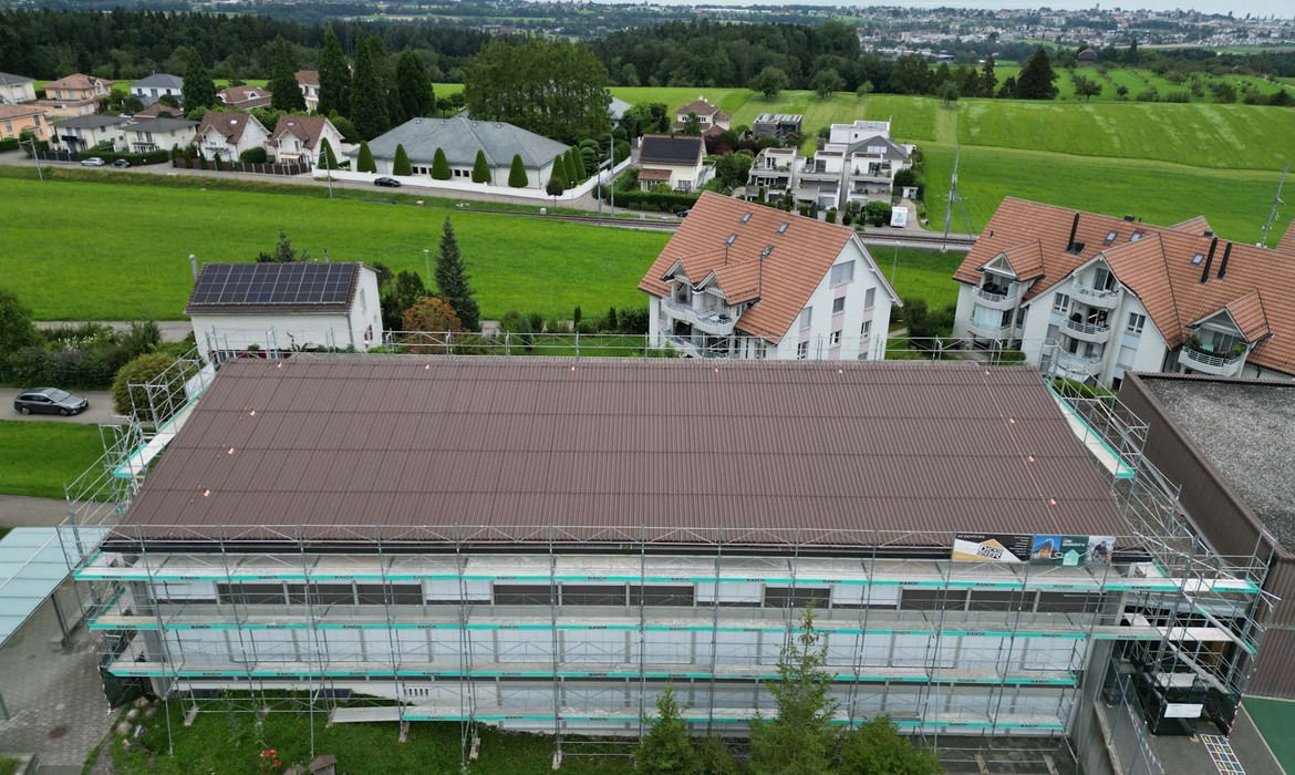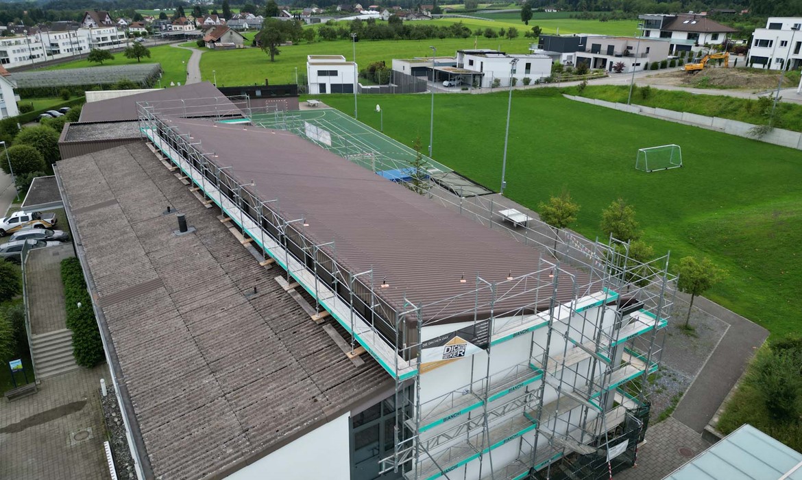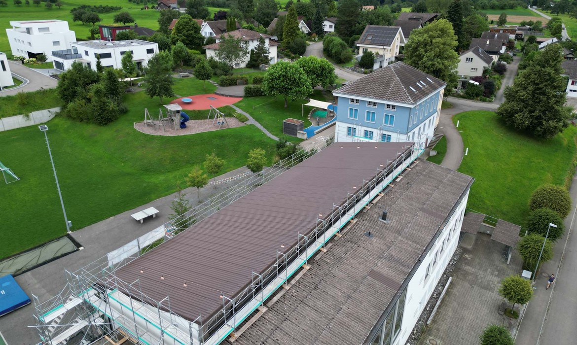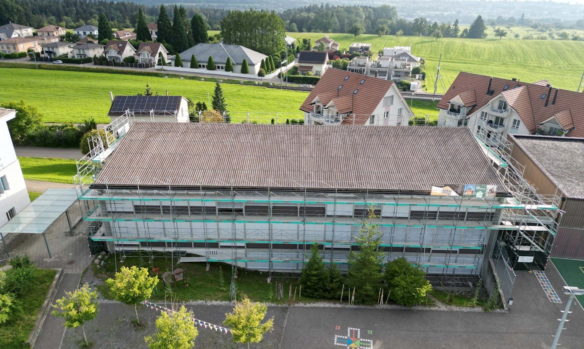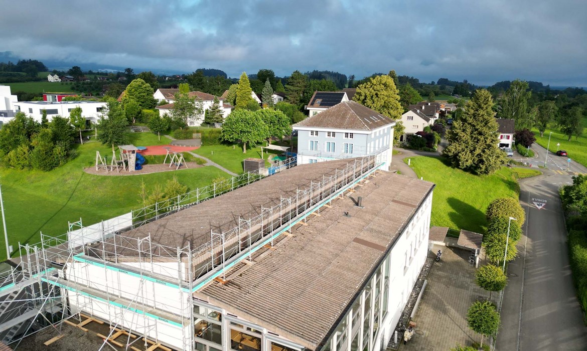 Neue Dacheindeckung mit Welleternitplatten Schulhausgebäude Primarschulgemeinde, Freidorf TG - Juli 2024